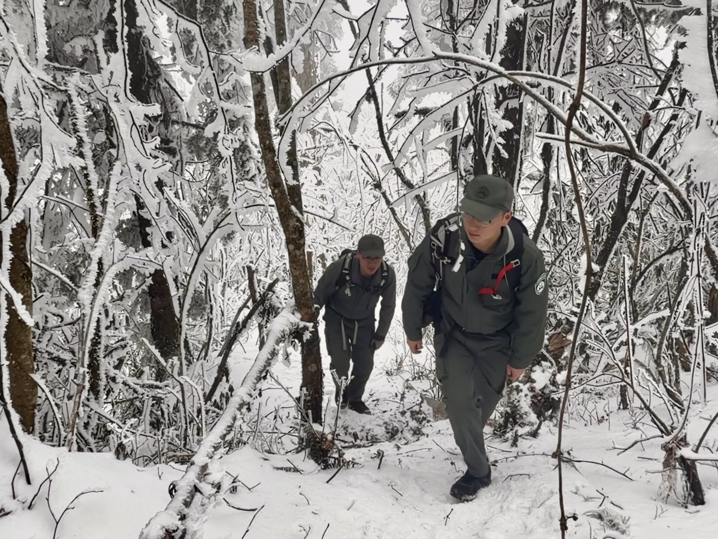 筒靴有点大,走起路来鞋底有些打滑,但踩进深深的雪地里确实不湿脚了。王伟已经在山里摸爬滚打了七年,毛军刚入职一年,两个人是巡山的“搭档”。一人负责巡护,另一人则负责科研,是站里常见的组合。