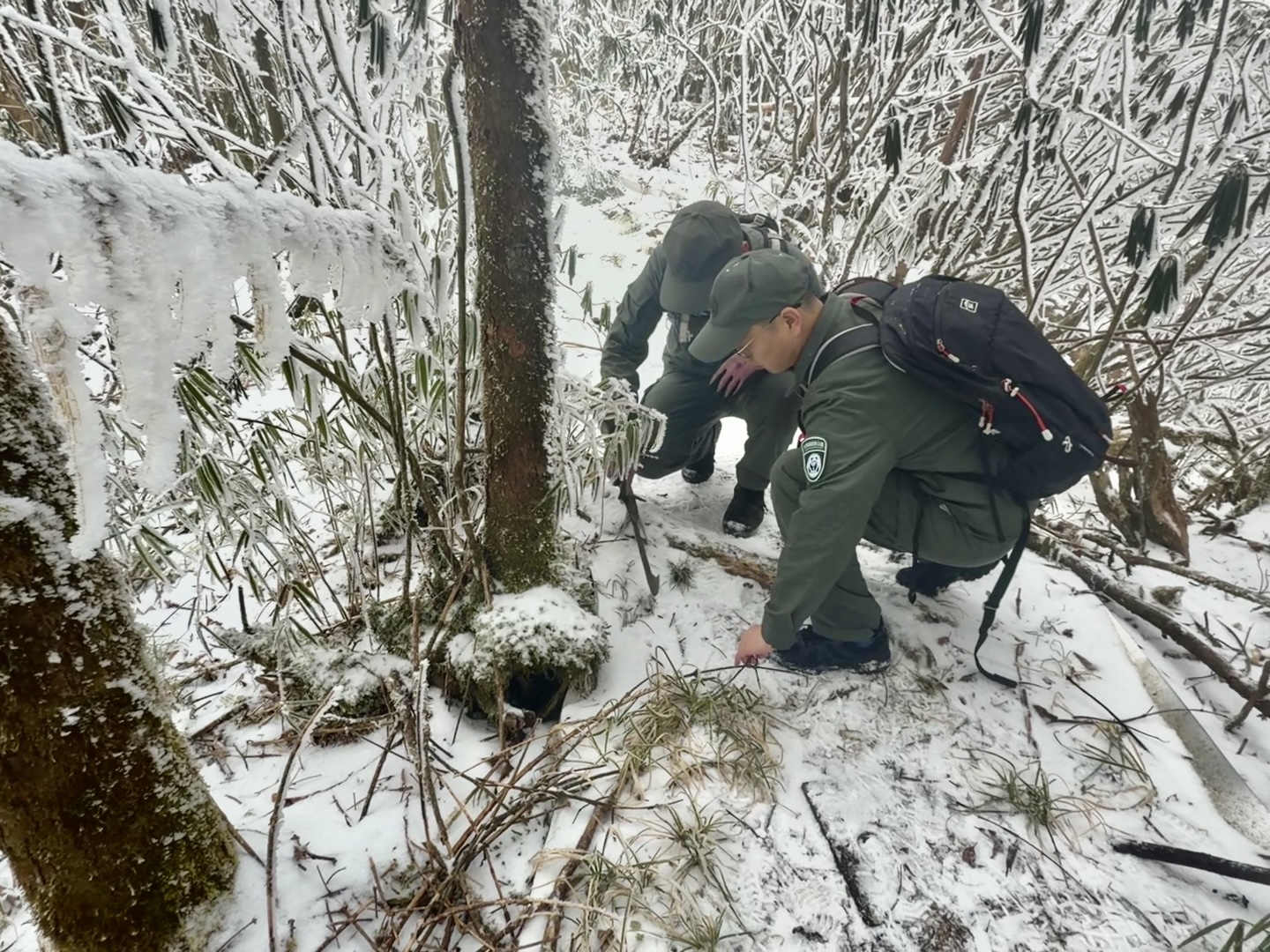 野生动物监测员的工作,是从学会“阅读”寂静的山林开始。记者走在山路上,找寻大自然留下的“字”:雪地上的蹄印,是毛冠鹿留下的;树根边墨绿色的物体是豹猫粪便,末端的那个尖儿就是典型特征;野兽行走的兽径旁矮矮的冷箭竹是大熊猫的主食竹之一,长得茂密表示它们可能来过……雪一层一层盖下来,痕迹越来越难寻。