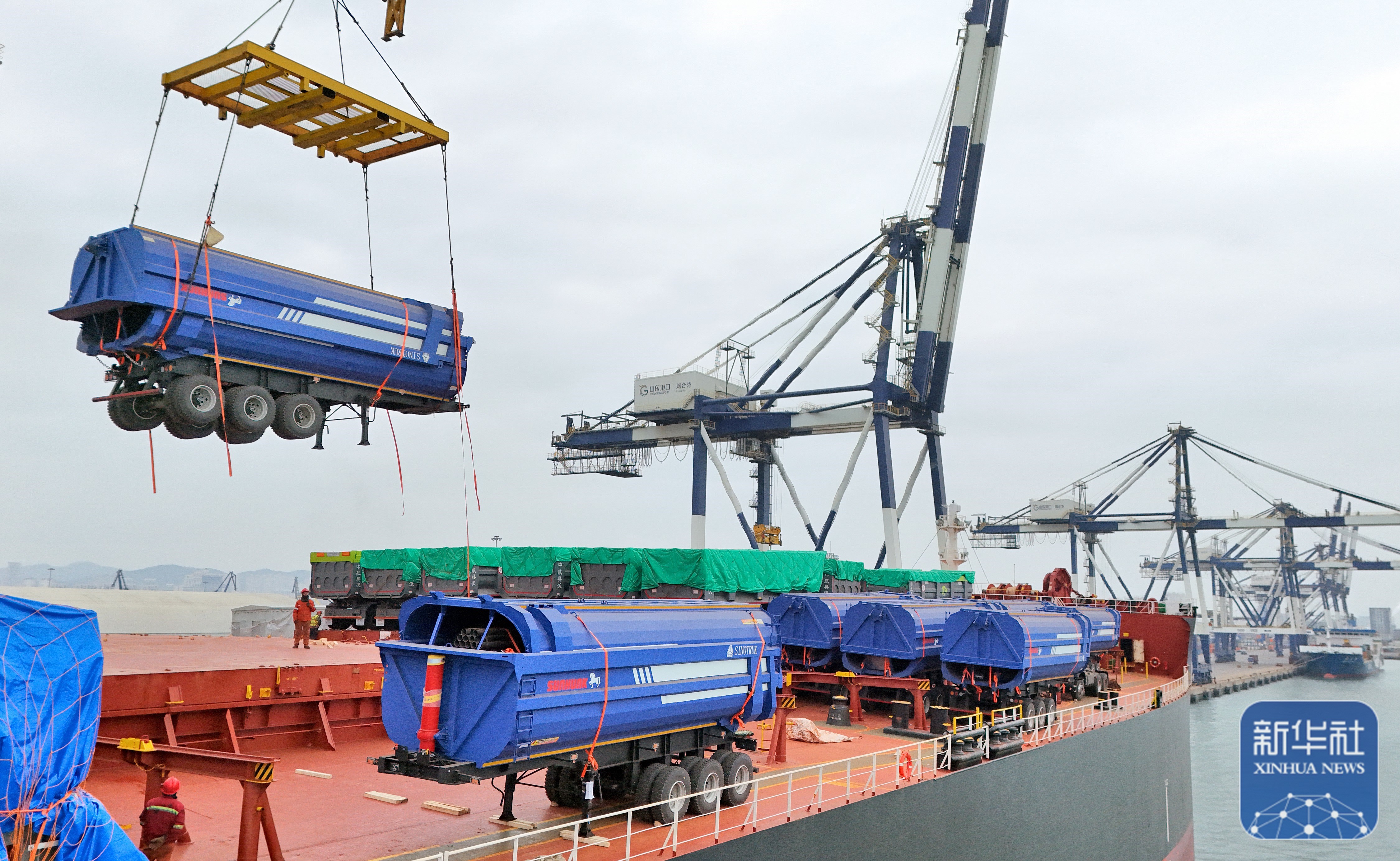 ↑ 2月24日,在山东港口烟台港,工人将出口卡车吊装上船(无人机照片)。新华社发(唐克摄)