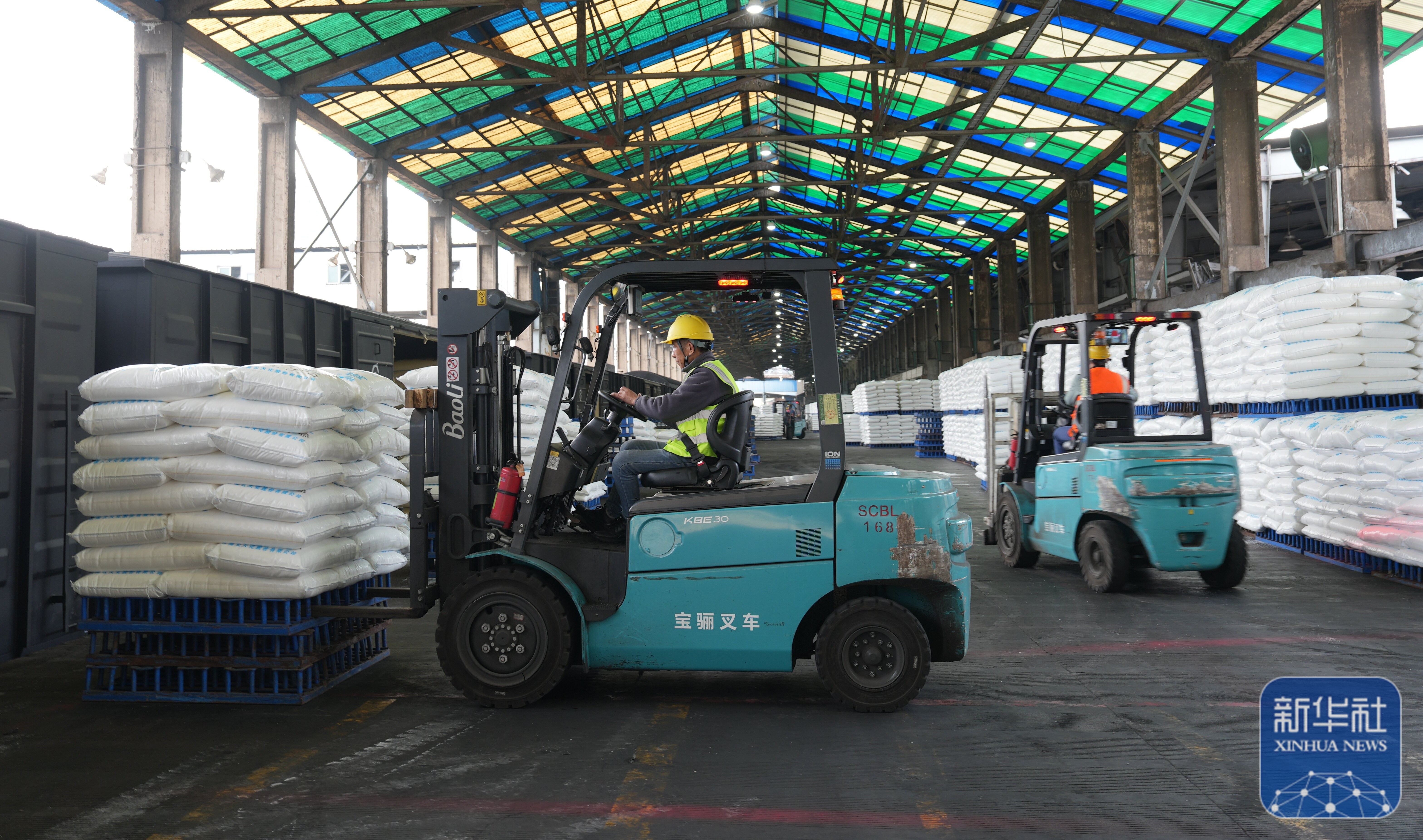 ↑ 2月24日,在云南水富云天化有限公司火车发货站台,工人在用叉车转运化肥。新华社发(狄廷秀摄)