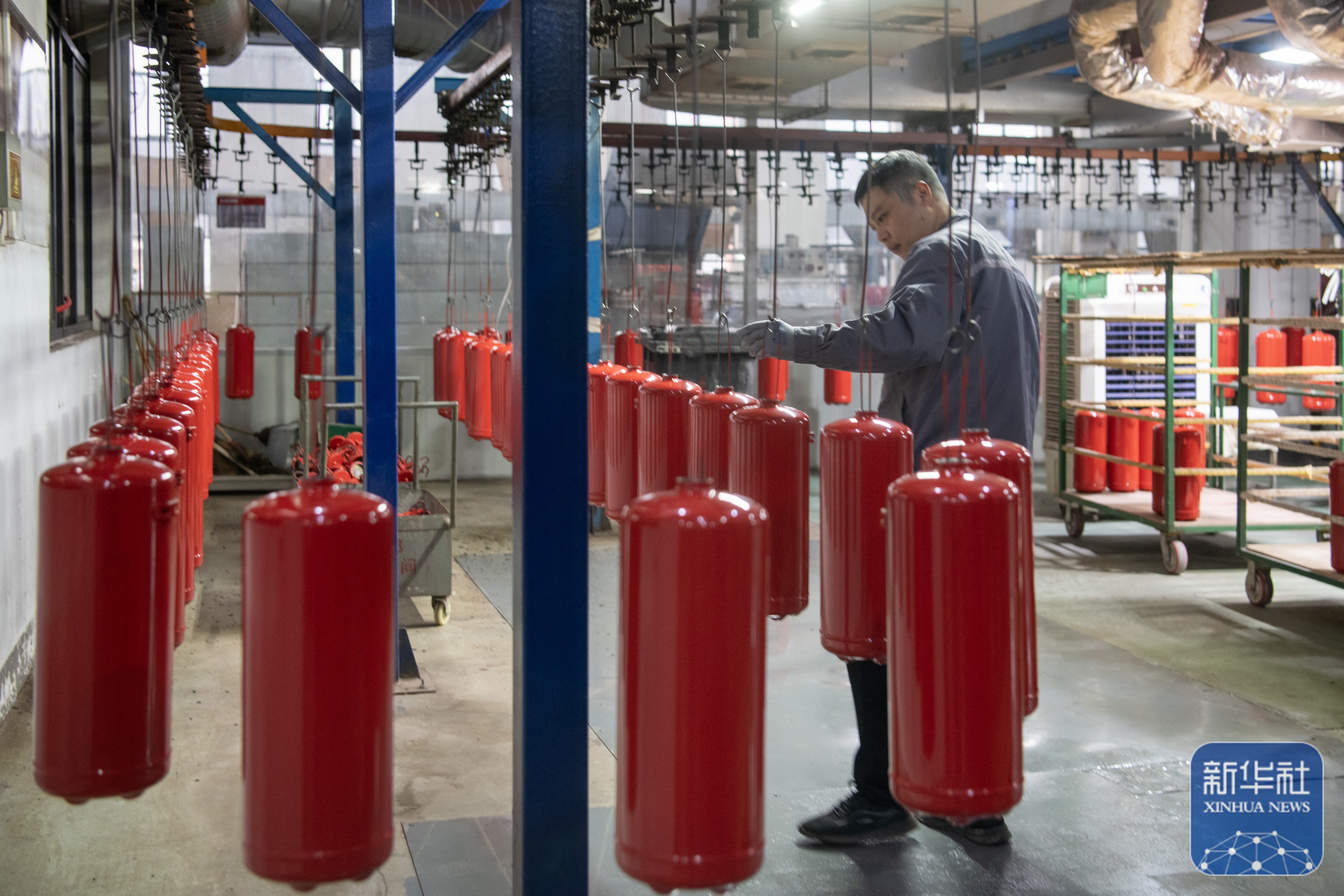 ↑ 2月24日,在位于浙江省余姚市黄家埠镇的宁波凯旋消防器材有限公司生产车间,员工在检验消防器材零件。新华社发(张辉摄)