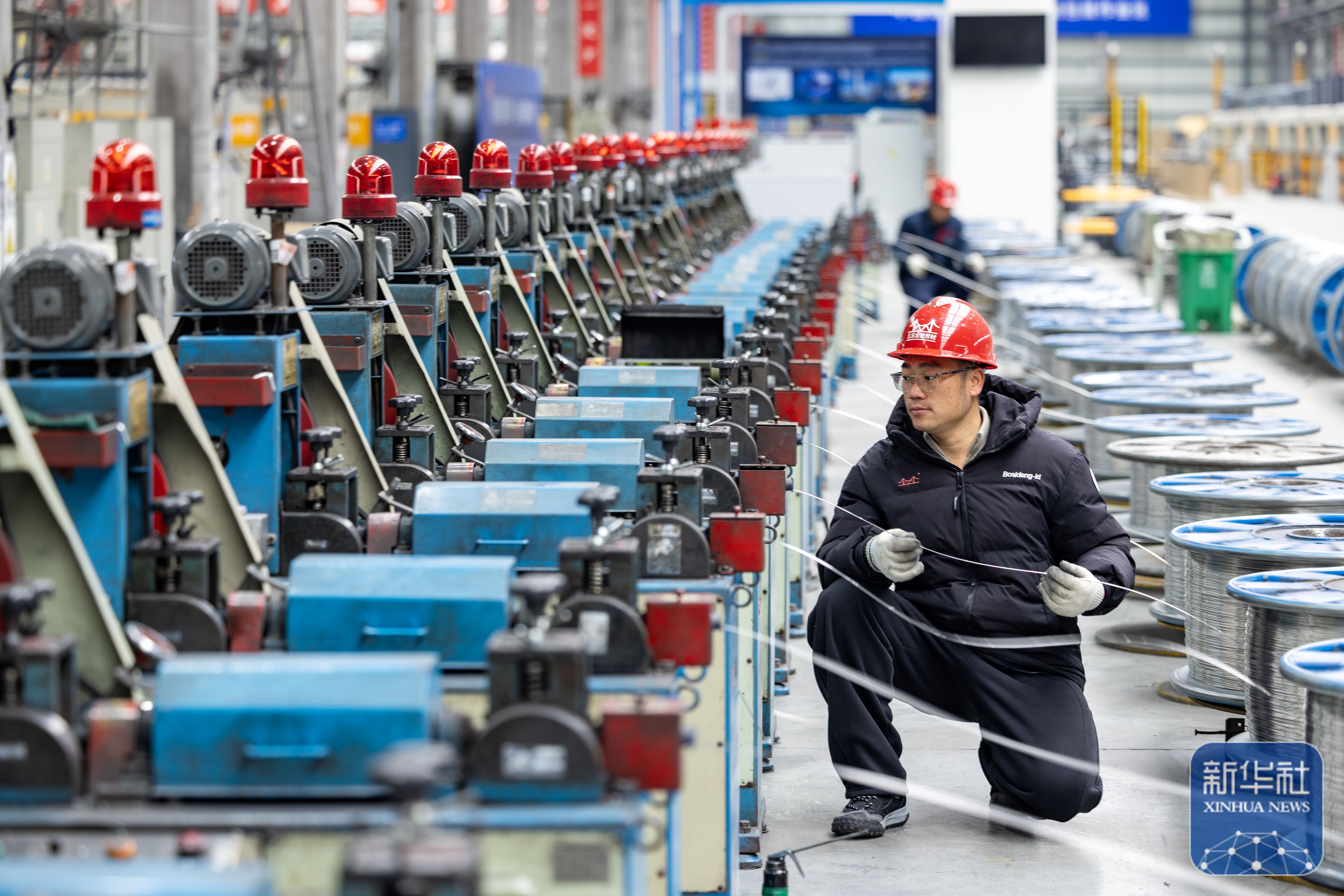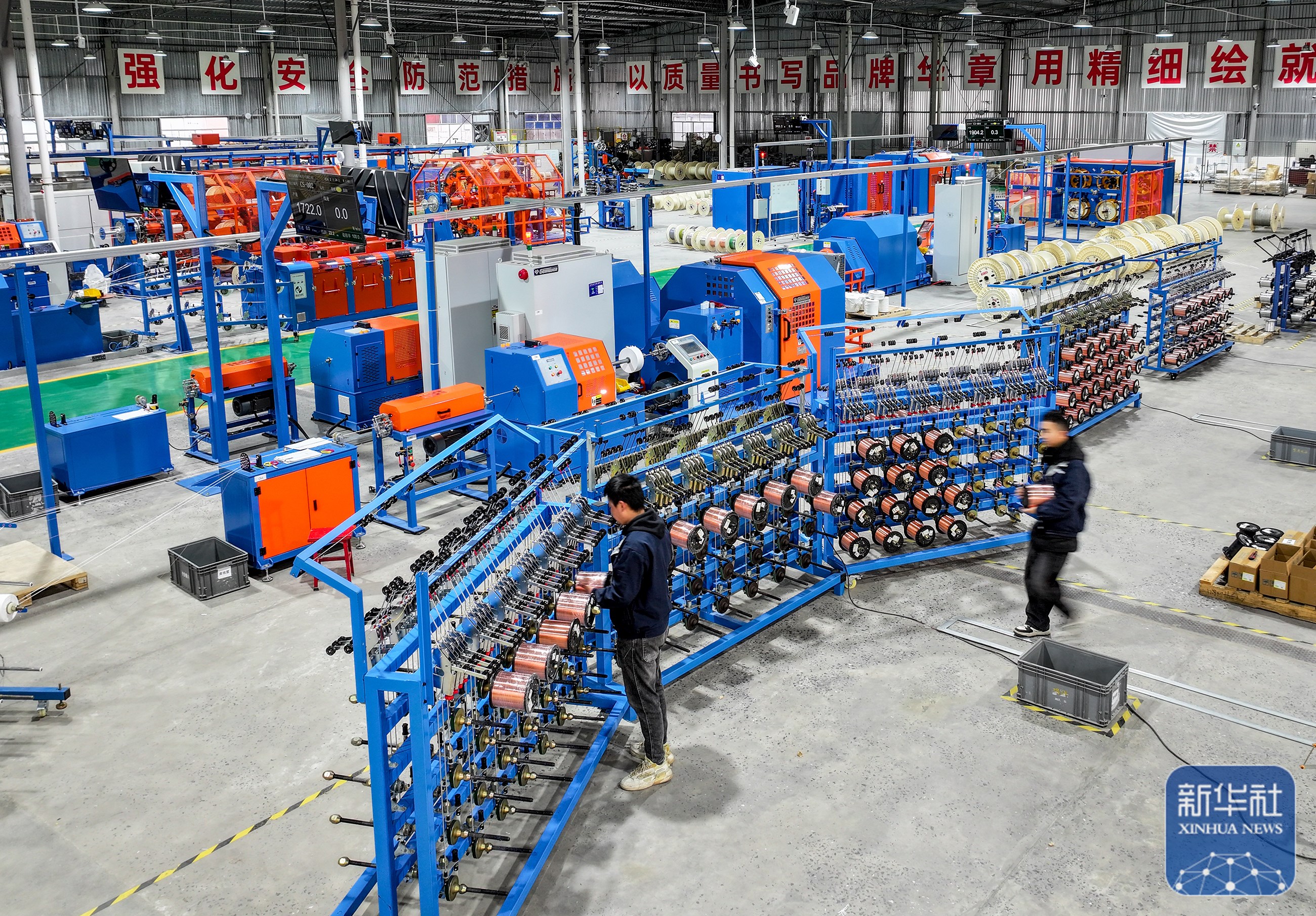 ↑ 2月24日,在四川省华蓥市华蓥山经开区拓自达电线(四川)有限公司智能车间,工人利用机械设备生产订单产品(无人机照片)。新华社发(邱海鹰摄)