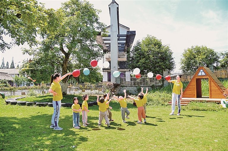 四川泸州天骄托育园的老师带领孩子们做游戏。新华社发