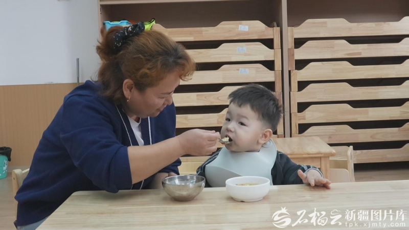 伊犁州托育综合服务中心保育员在给孩子喂饭(资料图片)。 伊宁市融媒体中心供图
