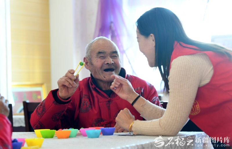2月6日,裕民县社会福利园区工作人员与老人一起做游戏。石榴云/新疆日报记者 韩亮摄