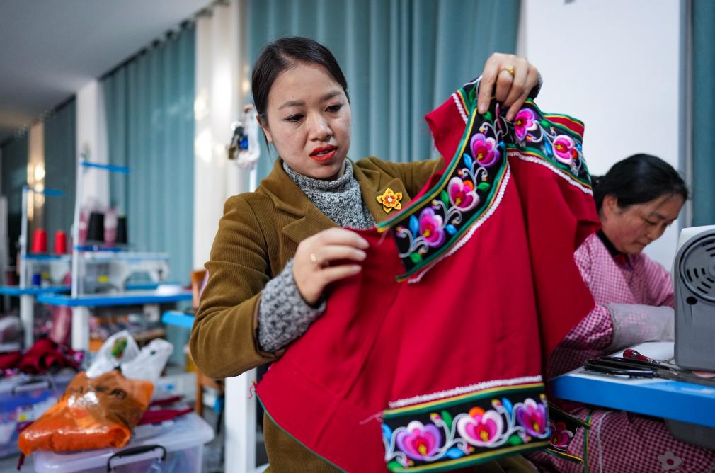 金瑞瑞在自己的工作室内查看彝绣服饰。新华社记者 陈欣波 摄