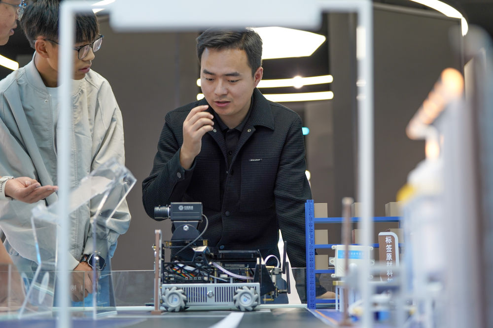 2025年10月29日,郑棋元(右)在云南技师学院利用沙盘模型与学生探讨研发项目。作为2025年认定的“大国工匠人才”,郑棋元曾在第45届世界技能大赛上夺得移动机器人项目金牌,实现中国队在该项目金牌“零的突破”。赛后,他选择回到母校任教,致力于培养技能人才。