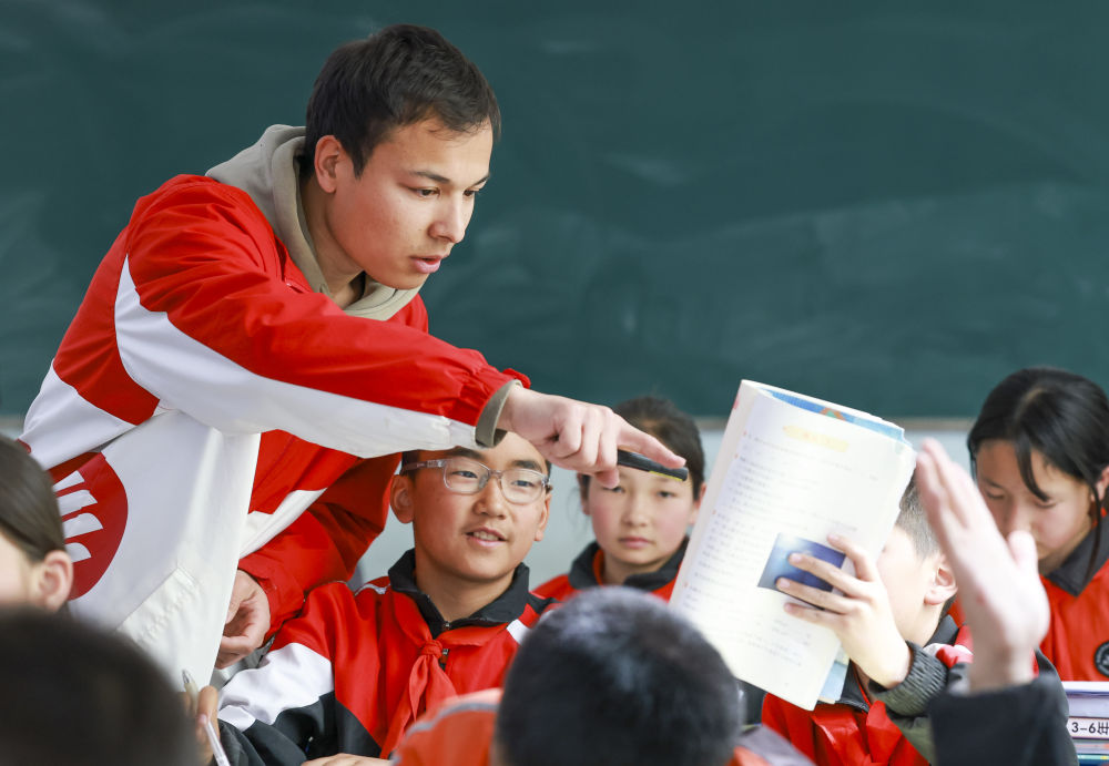 2025年4月23日,在新疆克孜勒苏柯尔克孜自治州阿图什市哈拉峻乡谢依特小学,支教教师麦麦提伊敏·库迪热提给学生上课。他所服务的戍边支教西部计划志愿者服务队,在这所边境小学辛勤耕耘,用教育为祖国边疆播种希望,并因此荣获中国青年五四奖章。