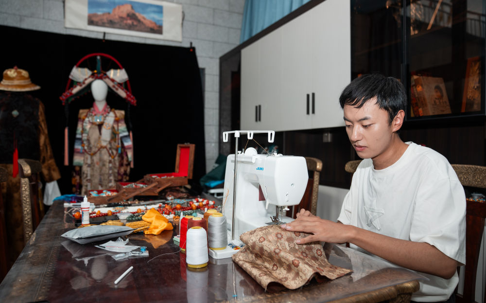2025年9月11日,藏装设计师班珠丹塔在位于拉萨的家中缝制藏装。他将藏族传统艺术元素与现代设计理念相结合,让藏服焕发新的时尚活力,其作品登上国内外文化舞台,诠释着传统之美。
