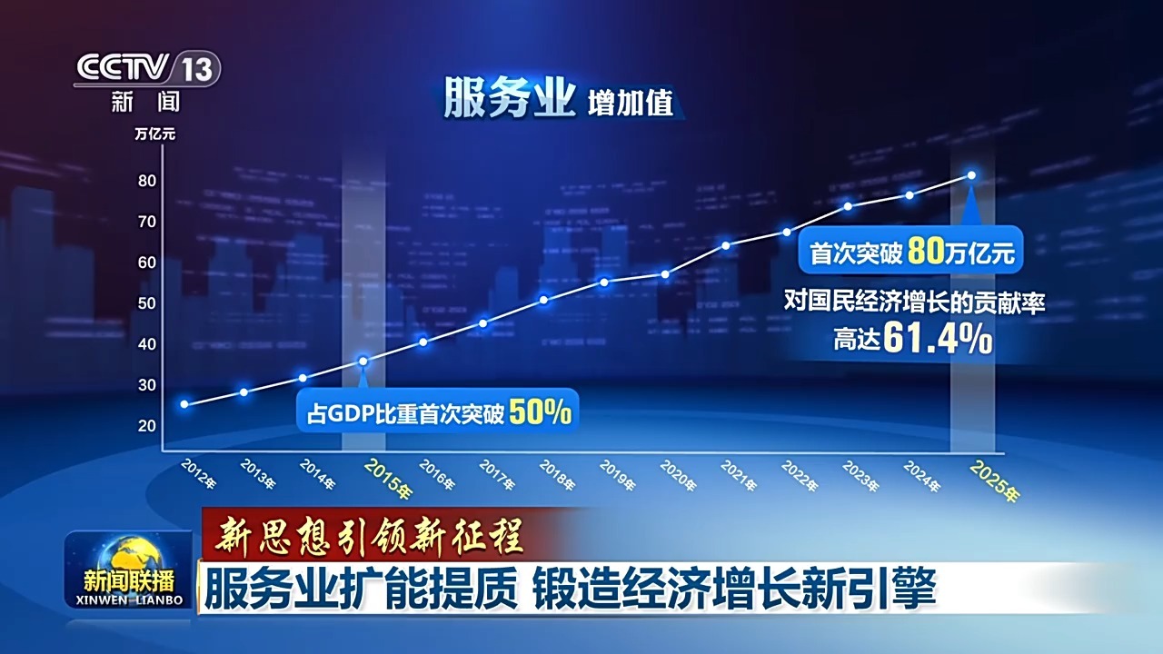 2015年,服务业增加值占国内生产总值的比重首次突破50%,此后连续11年占据国民经济半壁江山。2025年服务业规模首次突破80万亿元,对国民经济增长的贡献率高达61.4%,作为经济社会发展的主引擎地位更加坚实稳固。