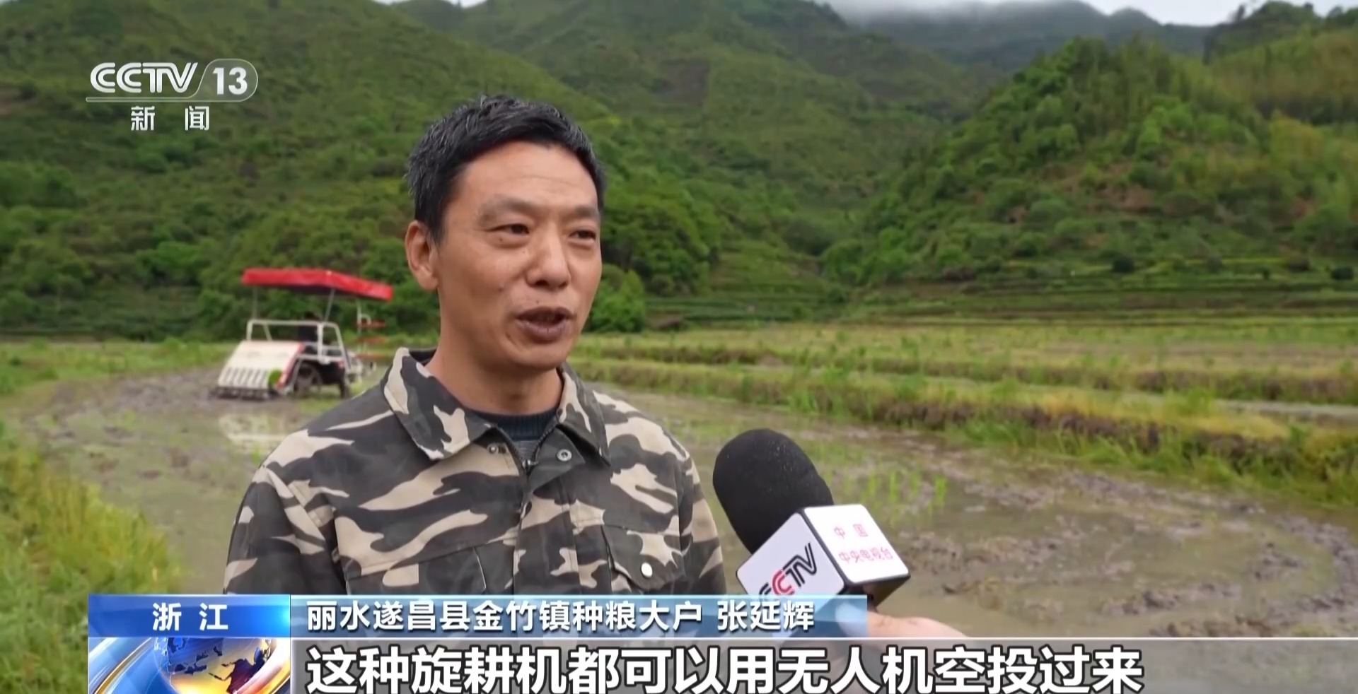 丽水遂昌县金竹镇种粮大户 张延辉:以前我们巴掌地都要自己或者请人工,费时费力。现在这种旋耕机空投过来了,旋耕效果好,对我们农户来说又实用又方便。