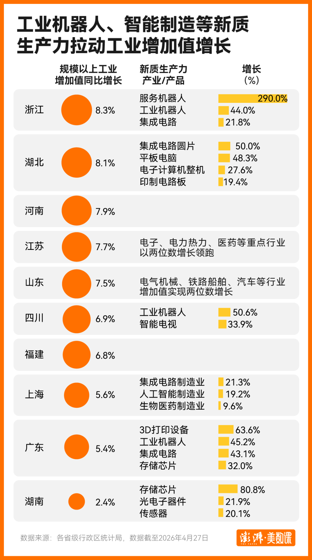 工业是经济大省发展的“压舱石”。一季度,经济大省工业数据表现亮眼,7个经济大省的规模以上工业增加值同比增速高于全国(6.1%),且从公布的数据看,经济大省新质生产力相关产业的工业数据增速迅猛,几乎多是两位数增长。比如,浙江一季度服务机器人产量增加2.9倍,广东一季度3D打印设备产量增长63.6%,湖南一季度规模工业企业存储芯片产量增长80.8%。