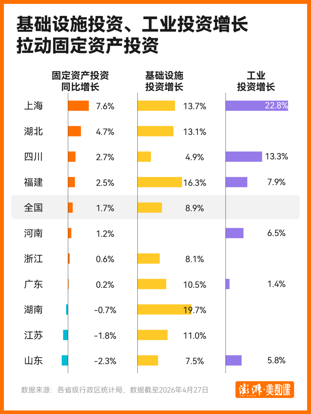 上海、湖北、四川、福建固定资产投资增速高于全国。分领域看,经济大省的工业投资、基础设施投资增速都较高,不少省份增速达两位数。比如,上海一季度工业投资同比增长22.8%,城市基础设施投资增长13.7%;湖北省一季度基础设施投资增长13.1%;湖南省一季度基础设施投资增长19.7%。