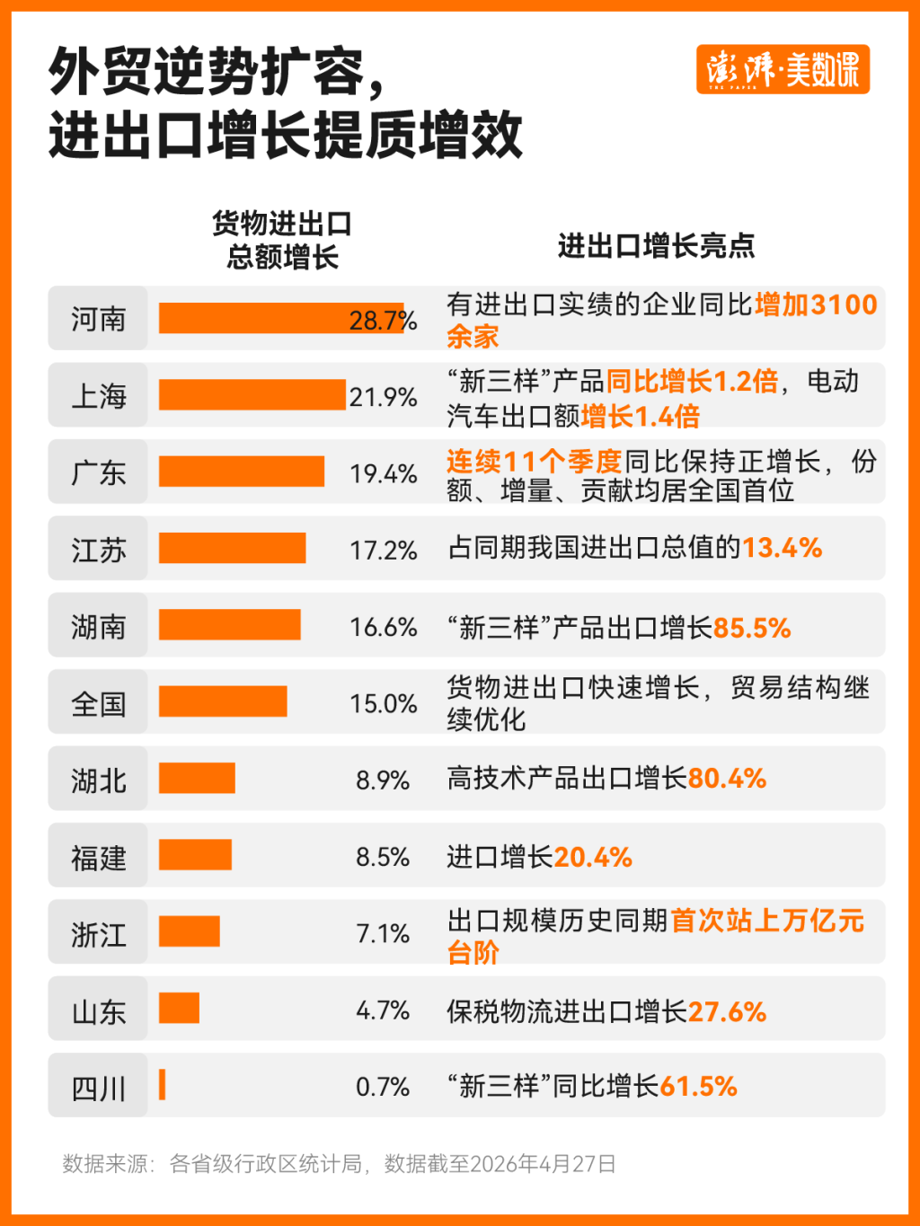 一季度,河南、上海、广东、江苏、湖南5个经济大省的外贸总额增速高于全国,河南、上海高达28.7%、21.9%。广东外贸总额已连续11个季度保持同比正增长,同时,今年一季度全国份额(21.5%)、增量(4127.9亿元)、贡献率(26.7%)全部领跑。此外,浙江出口规模历史同期首次站上万亿元台阶。